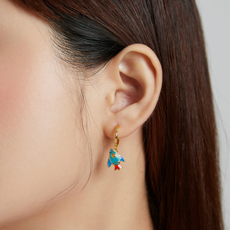 To infinity and beyond! This tiny rocket ship will take you places you've always dreamed of. Creative cartoon rocket ear studs, embellished with sparkling zircon and real gold, the design of contrasting colors and dripping oil are full of fun.
