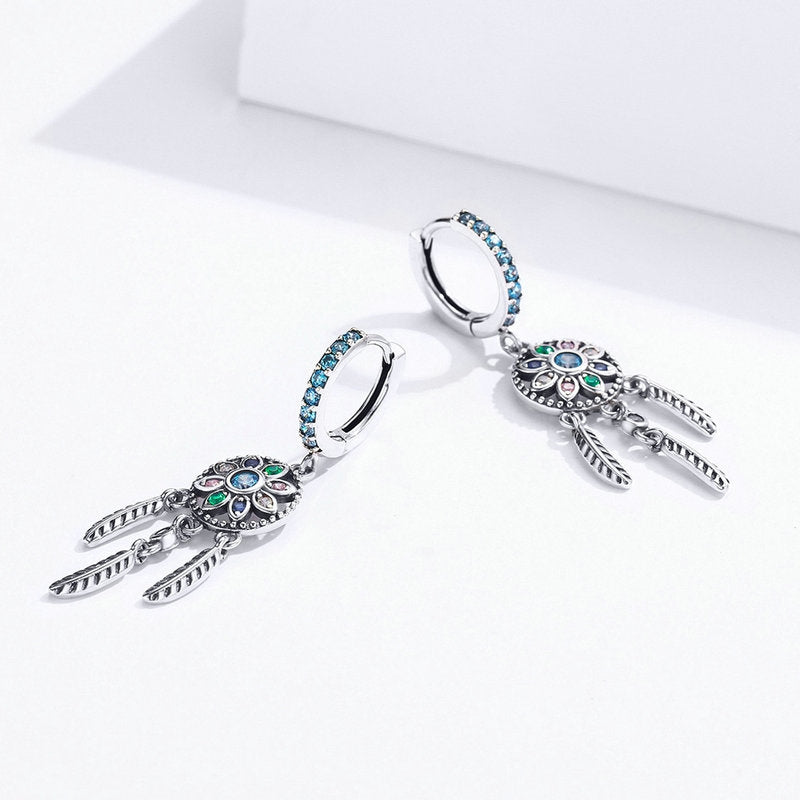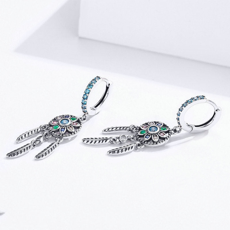 Weave a spell in fashion with these enchanting drop earrings. These earrings each feature a classic dreamcatcher design with Creating in sterling silver, each mystical earring features an open-worked dreamcatcher with a trio of sculpted feather dangles. Textured platinum vermeil on sterling silver leaves glistens. Buffed to a brilliant luster, these earrings are secure with French wire backs.