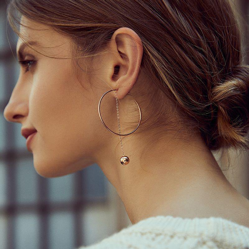 Bamoer large rose gold hoop earrings with a little ball dangling on the bottom. The rose gold dangly ball naturally hangs down from the beautiful fashionable big huggie hoops.