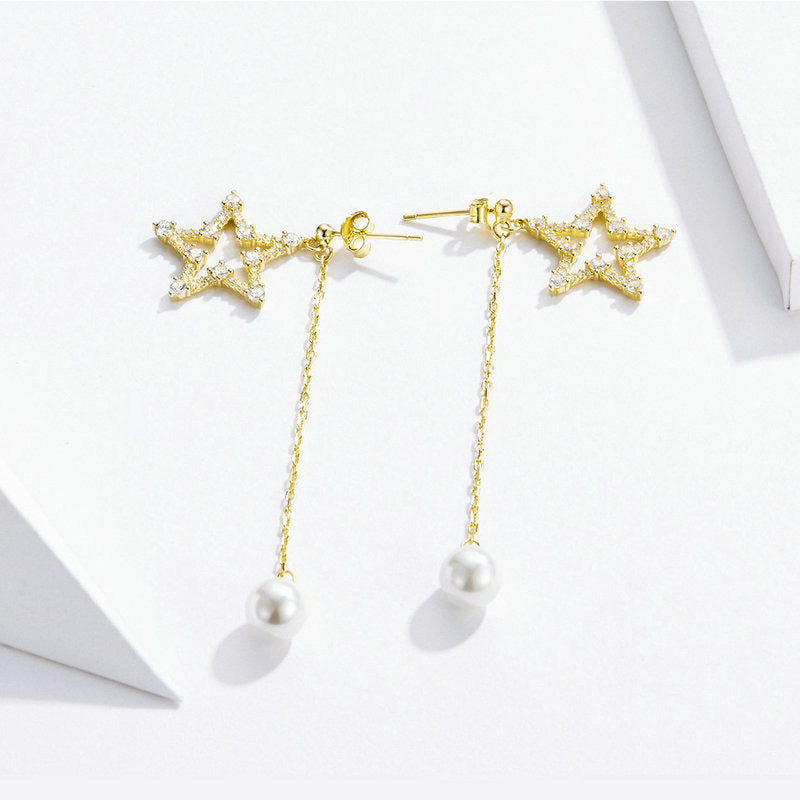 Bamoer long pearl star dangle earrings make you be a star at the party! The stars and pearl just aligned. Upgrade your ear stack in these delicate stud earrings, with single star detail.