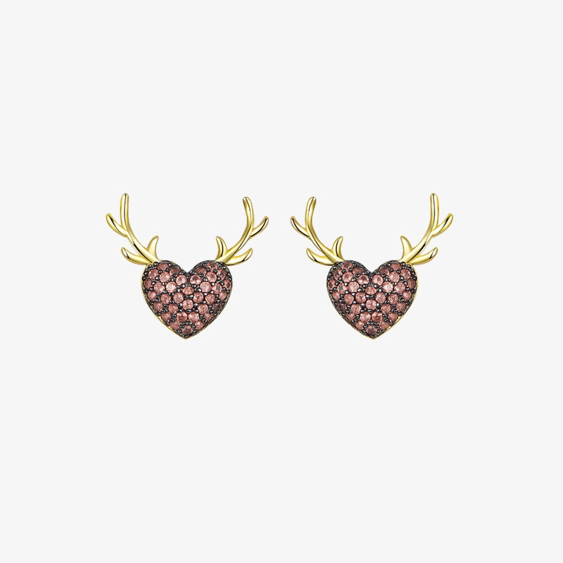 The?beautiful stud earrings combine the elements of love and antlers. The heart is electroplated with black gold and paved with red zircons, which are decorated with a pair of gold-tone plated antlers.