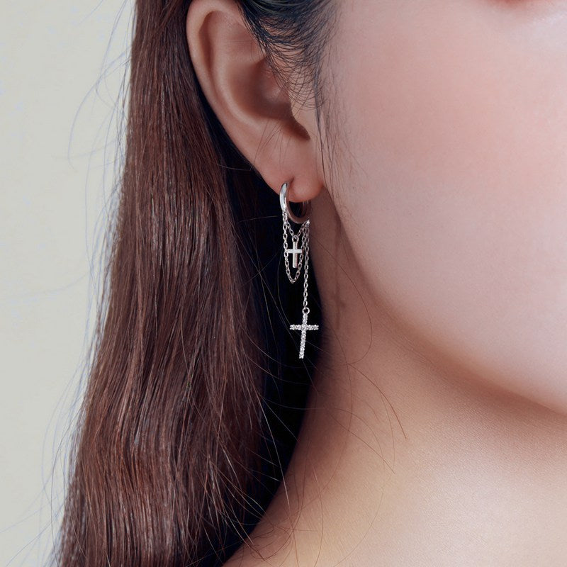 This dangly cross-chain earring features double holy creative cross hangings down naturally. ?The classic?cross elements are inlaid with shining zircons, making your daily style more fashionable. It also?symbolizes infinite purity and sincerity.?