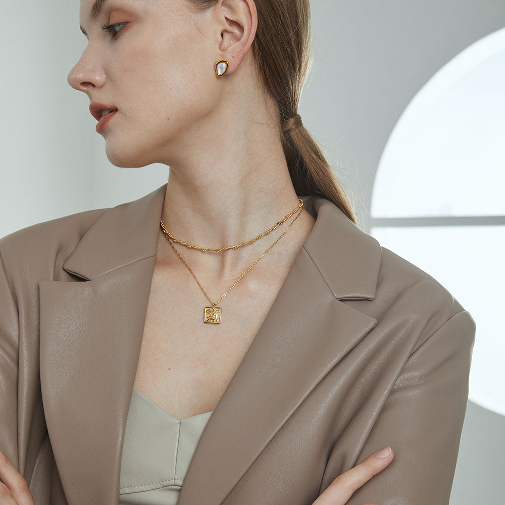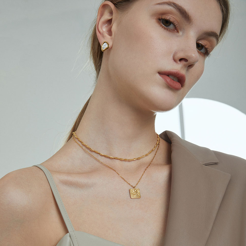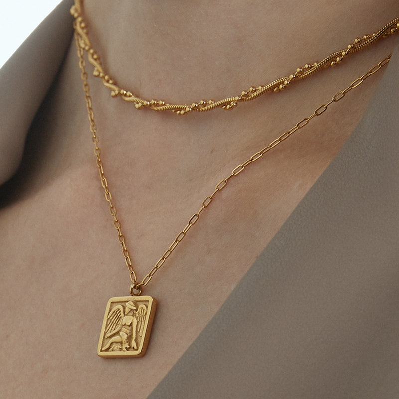 This double chain layered necklaces with angle coin pendants use quality 14k gold vermeil. The square pendant carved with an elegant angel comes on a gold-plated chain. Thanks to its ingenious hinge mechanism, the square-cut pendant is textured. Matching with a delicate gold-plated necklace, it is unique and full of fashion sense.