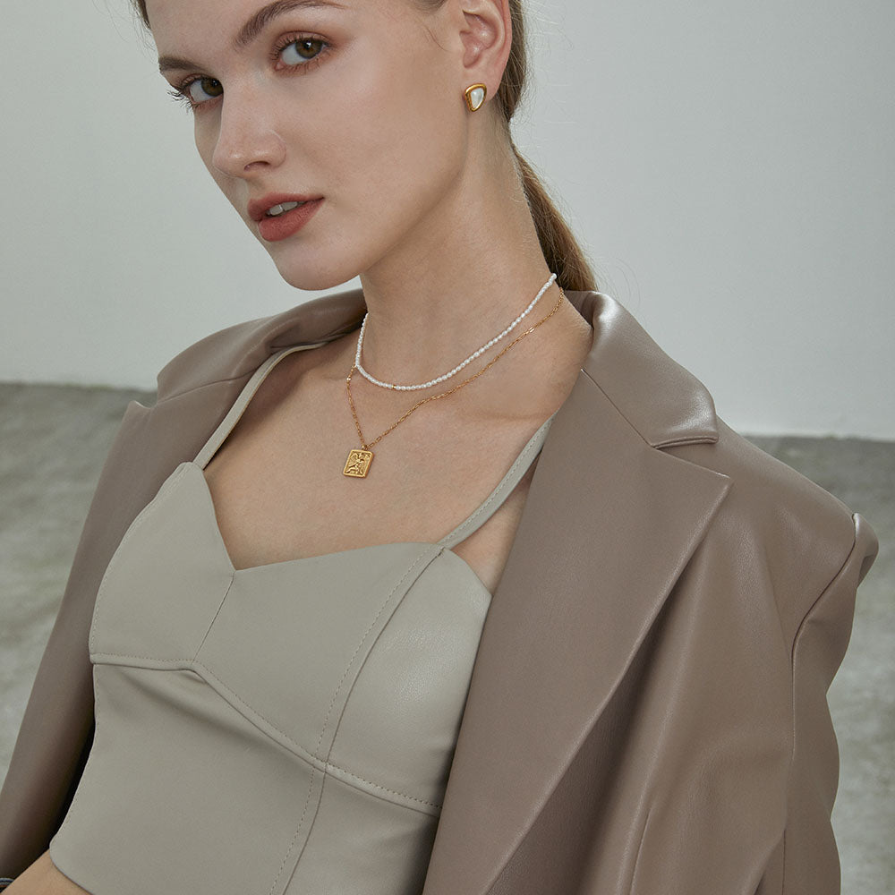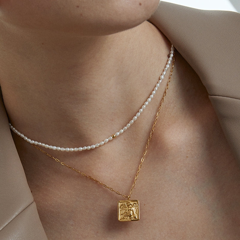 Layering necklace set including single pearl choker necklace and gold angel necklace, SET OF 2.?The square pendant carved with an elegant angel comes on a gold-plated chain. Thanks to its ingenious hinge mechanism, the square-cut pendant is textured. Matching with a delicate pearl necklace, it is unique and gentle. Make this personal piece be your essential adornment.