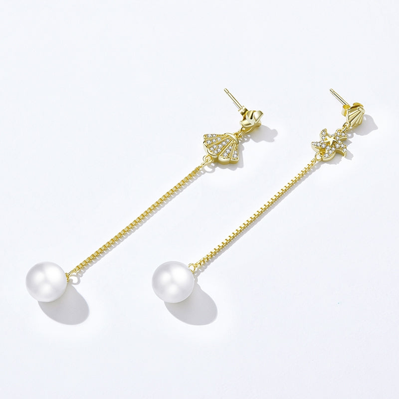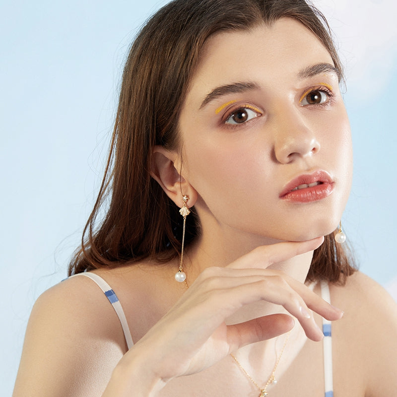 The gold-plated shell pearl long dangly earrings are shining under the sun, look?elegant and noble.?A bright fresh pearl is your unique elegant temperament.? Perfect for attending beach weddings or as friends gift.