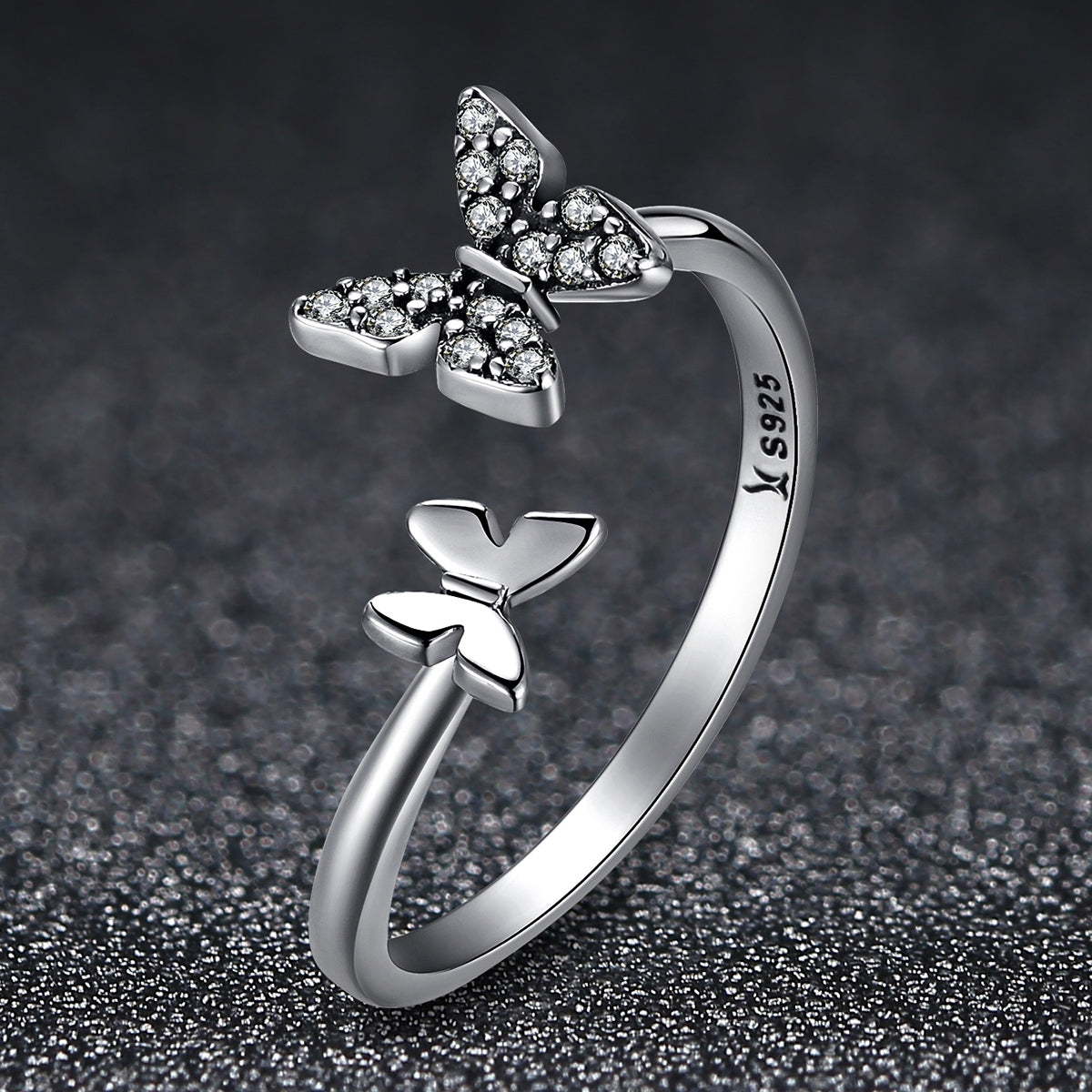 This butterfly ring is?925 sterling silver earrings hypoallergenic. Inlaid with bright gems, this open ring has two?butterflies on both sides. Just like two butterflies playing among the flowers, but now on your fingers. There are total two colors including rose gold and sterling silver. Perfect gift for those who love butterflies for your best friends.
