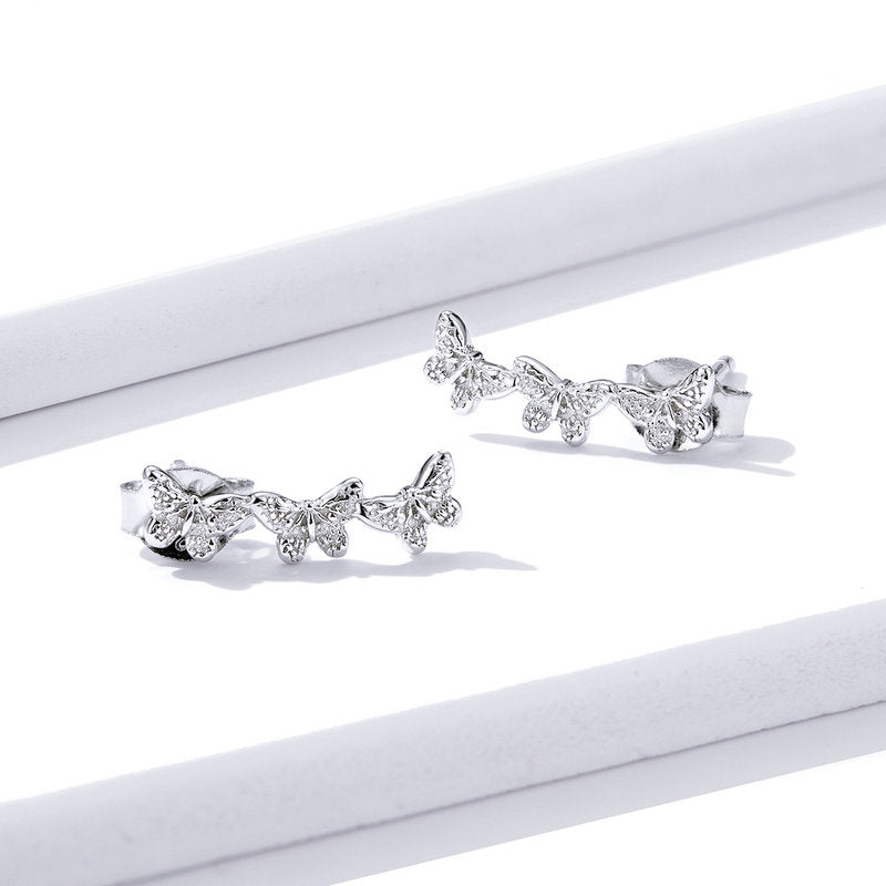 This flying butterfly stud earring has three butterflies arranged in a line, which seems to climb on your ears. The butterfly climbers earrings are hand-made of 925 sterling silver, whose surface is plated platinum to keep them from tarnishing and to keep them shining.