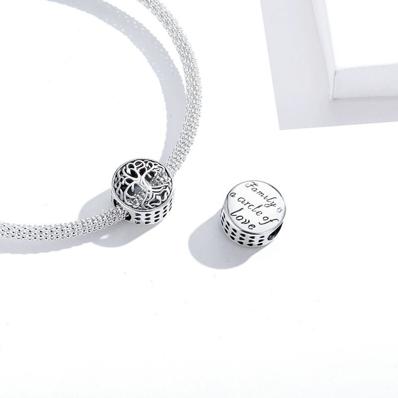 This Bamoer family tree charm bead is unique with the back on the?sentence of "Family is a circle of love." Trees are considered representative of life, wisdom, power and prosperity. This silver tree is a symbol of power and energy.? The Tree of life holds the vein of life and breeds flowers and fruit. You need to have your own tree and master your own destiny bravely.
